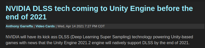 Just as a follow-up, I updated my GeForce Experience today (I have an RTX 2070 Super) and they had the Unity DLSS update notice right on the front page, so nVidia is as excited as Unity. There was a link to the Unity announcement on YouTube, so here you go if you want to see it in action and more info about what it does. The Unity guy in the video is the prototype geek, you'll love him. EDIT: Just for fun, here's another video nVidia is sharing about a new game Mortal Shell where they have DLSS enabled: