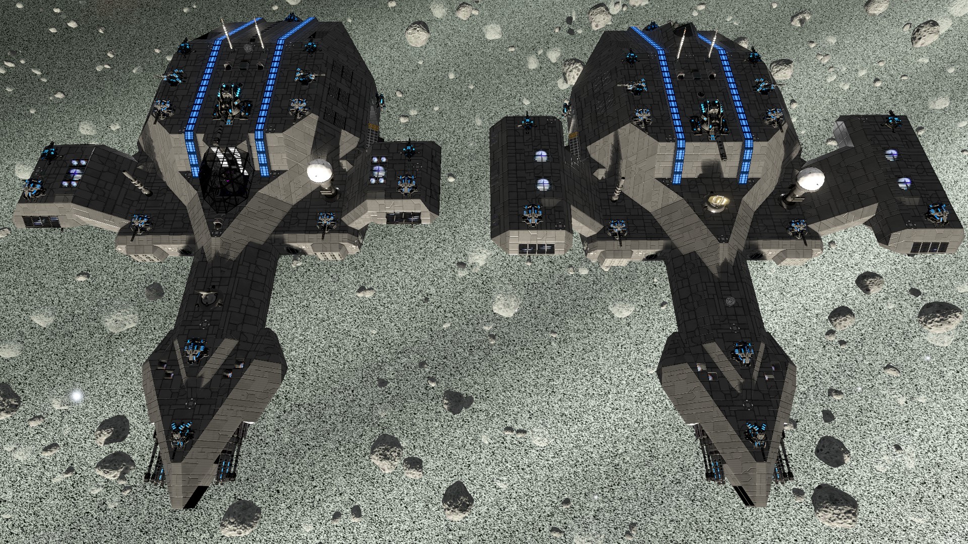 I decided to revisit a very old build and decided that I did not like how I did the nacelles way back when. I also decided that I did not like the placement of the shield generator. So, redid the nacelles and moved the shield generator to the rear of the craft. I figure I will update the old blueprint once I am done tweaking it. Original is on the left, the rework is on the right.
