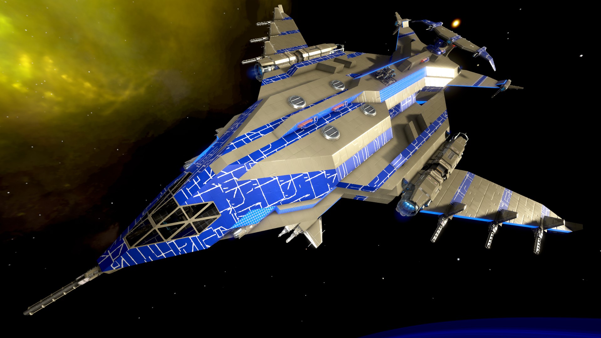 Got my Survival RE CV up to 9 auxiliray cores, and it's now starting to feel a bit cramped. Despite upgrading all turrets to their Heavy equivalents, I still have a few hundred thousand CPU remaining, but no space to add more turrets (which I assume I will need in order to take down Legacy ships), and running out of room to add more shield enhancers. So, back to creative to try to build a new CV with a bit more room for combat stuff. Also decided that my current SV is getting a bit long in the tooth, so I decided to make a new, stronger one. I figured the Wyvern I'd already built was the right size (if a bit big) so I went and changed that weird noodly appendages for a more conventional design. While the conventional design has far less roll speed, it looks better (imo at least, as I based it on the Vanguard series from Star Citizen) and should be more fun to use overall. The main problem is it's too big to fit through even that largest CV Hangar door, so I'm having to make a 'custom' one from the shutter hatches. Wyvern (old version) Wyvern (new version)